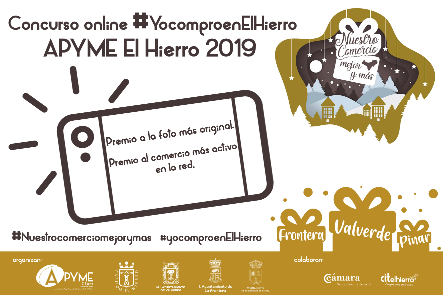 La Campaña de Navidad “Nuestro comercio, mejor y más” es organizada por #APYME El Hierro, dirigida a las empresas y comercios locales, con el apoyo del Cabildo de El Hierro y los Ayuntamiento de Valverde, Ayuntamiento La-Frontera, Ayuntamiento de El Pinar de El Hierro y la colaboración de la Cámara de Comercio – Delegación de El Hierro y el CITElHierro
