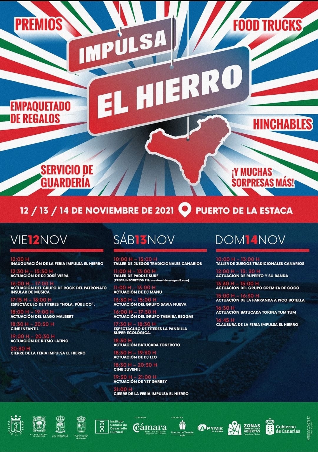 Un evento de promoción comercial que tendrá lugar en el Puerto herreño de la Estaca del 12 al 14 de noviembre, organizado por la Asociación de la Pequeña y Mediana empresa de El Hierro (APYME), el área de Empleo y Desarrollo Económico del Cabildo de El Hierro, Zonas Comerciales Abiertas del Gobierno de Canarias, los ayuntamientos de Valverde, La Frontera y El Pinar y el Instituto Canario de Desarrollo Cultural, con la colaboración de la Cámara de Comercio y Puertos de Tenerife. Impulsa El Hierro-Puerto, está financiado con 18.000 euros de fondos públicos otorgados por el Gobierno de Canarias a APYME – El Hierro dentro del programa Consume Canarias.